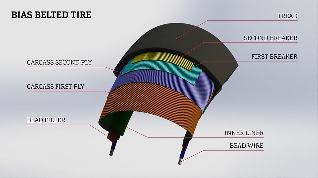 Bias belted tyres are actually diagonal tyres with a reinforced diagonal belt under the tread surface. These tyres are designated with the B letter (diagonal belted tyres), e.g. 130/90B15. These tyres are ideal for higher cubic capacity motorcycles whose chassis is not adapted to radial tyres and demand for stronger tyres.
