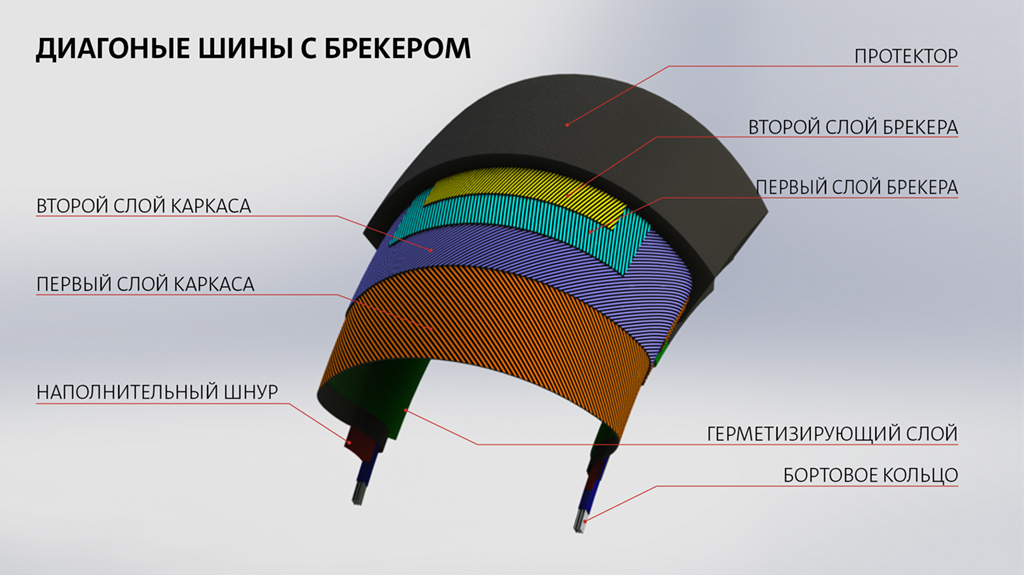 Шины с диагональным кордом – имеют самую давнюю технологию и наибольшее распространение на рынке. Каркас шины с диагональным кордом состоит из двух или более слоев текстильного корда (вискоза, нейлон, полиэстер), которые пересекаются под определенными углами. Шины с диагональным кордом – правильный выбор для небольших мотоциклов с меньшим объёмом двигателя, мотороллеров и старых мотоциклов, шасси которых адаптировано к шинам с диагональным кордом.